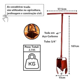 Cavadeira Trado Cabo em Tubo Aço Carbono 06pol 107cm, a cavadeira trado é uma ferramenta indispensável ??para abrir buracos, transplantar plantas, colocar postes, abrir valas para canos ou cavar e retirar a terra sem grande esforço. Tem por finalidade a coleta de amostras deformadas, determinação de profundidade do nível d'água e identificação dos horizontes do terreno.