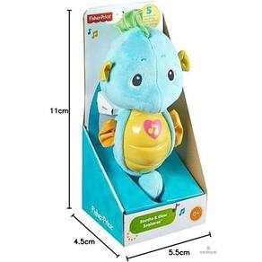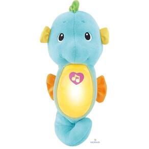 O macio e fofinho Cavalinho Marinho Fisher Price ajuda o bebê a dormir com um brilho suave e reconfortante, 8 canções de ninar e músicas clássicas e sons relaxantes do oceano. Após cerca de 5 minutos de reprodução contínua, os sons e a música desvanece-se e o brilho da luz diminui. Se o bebê acordar durante a noite, outro abraço do bebê acorda também o cavalo-marinho por mais 5 minutos de música relaxante.