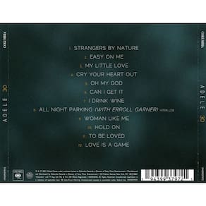 Adele (3)– Strangers By Nature 3:02 Adele (3)– Easy On Me 3:44 Adele (3)– My Little Love 6:29 Adele (3)– Cry Your Heart Out 4:15 Adele (3)– Oh My God 3:45 Adele (3)– Can I Get It 3:30 Adele (3)– I Drink Wine 6:16 Adele (3) With Erroll Garner– All Night Parking (Interlude) 2:41 Adele (3)– Woman Like Me 5:00 Adele (3)– Hold On 6:06 Adele (3)– To Be Loved 6:43 Adele (3)– Love Is A Game 6:43