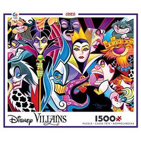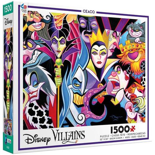 O quebra-cabeça dos vilões da Disney apresenta 1500 peças. Ele mede 32 polegadas x 24 polegadas quando concluído e é orgulhosamente feito nos EUA.