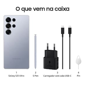 Disponível nas cores Titânio Preto, Titânio Cinza, Titânio Prata e Titânio Azul, o Galaxy S25 Ultra combina beleza, durabilidade e tecnologia. Para facilitar a migração do dispositivo antigo, o aplicativo Smart Switch permite transferir fotos, contatos, configurações e muito mais de forma simples.