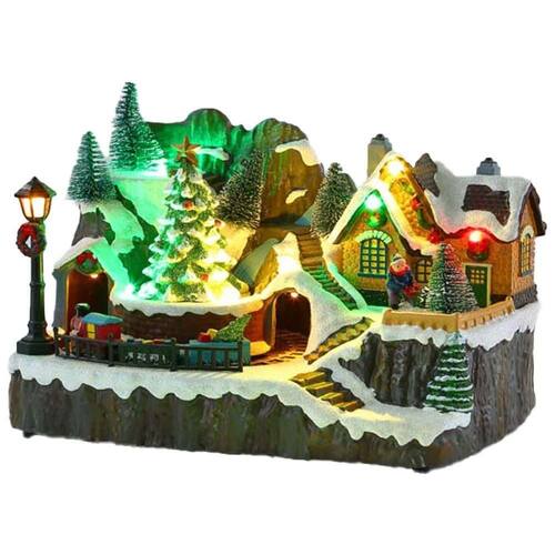 Cenário Natalino Vila Casa árvores Trem Movimento Com Iluminação Led Luz Natal Decoração