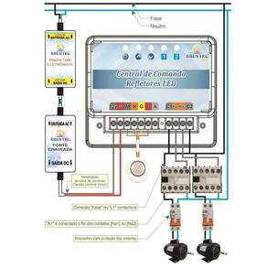 O modelo da Central de Comando Luxo Rítmica SMD 20A possui duas saídas auxiliares para acionamento de bombas ou outros aparelhos via controle remoto, independentes, sendo que cada saída suporta até 5A de carga, acima disso é necessário o uso de um contator.