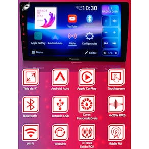 PRINCIPAIS CARACTERÍSTICAS: - Tela WSVGA de 9" Trapezoidal Touchscreen Capacitiva; - Conexão Wi-Fi; - Compatível com Android Auto (Wi-Fi / USB); - Compatível com Apple CarPlay (Wi-Fi / USB); - Compatível com WebLink/ WebLink Cast; - Informações Orig.inais do Veículo (Suporte ao CAN Bus); - Bluetooth para Ligações Hands-free e Streaming de Áudio; - 3 Pares de Saídas RCA Pré-amplificadas (4V); - Entrada para Câmera de Ré; - Entrada para 2° Câmera; - Entrada para Comando de Volante; - Saída de Vídeo para Monitor Traseiro.