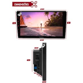 TELA: - Categoria DIN: Non-DIN; - Tamanho / Proporção: 9" Trapezoidal / 16:9; - Resolução: WSVGA (1024 x 600); - Painel: Touchscreen Capacitivo; - Luz de Fundo: LED; - Ajuste de Imagens: Brilho, Contraste, Cor, Matiz, Dimmer, Temperatura; - Tela de Abertura: Personalizável; - Papel de Parede: Personalizável; - Iluminação dos Botões: Personalizável (112 cores).