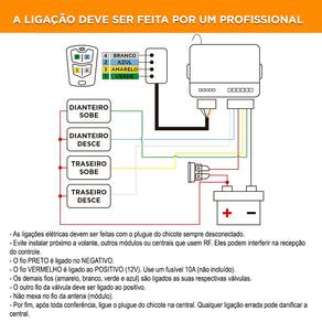CARACTERÍSTICAS: - Controle remoto compacto - Ideal para carregar junto com as chaves do carro - Possui indicação em LED para acionamento - Controle com placa para ligação ao bloco e controle interno - Módulo com 4 canais de saída: desce traseiro, sobe traseir, desce dianteiro e sobe dianteiro - Alcance aproximado: 50m em local aberto, sem interferência - Tensão de alimentação: 12vcc