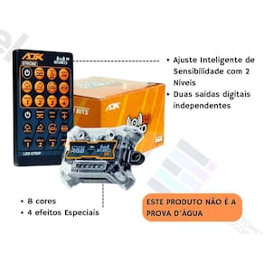 • Memória EEPROM; (Não perde os efeitos mesmo desligando os fios) • 8 cores (Vermelho, Verde, Azul, Branco, Ciano, Rosa, Amarelo e Laranja) • LEDs indicadores (Modo Auto, Modo Áudio e REC) • 4 efeitos Especiais • Ajuste Inteligente de Sensibilidade com 2 Níveis • Modo Automático com 2 Temporizadores • Compatibilidade com Fitas de LED Digitais 2811 • Compatível com Faróis AJK 3W, 6W,9W e fita led AJK 2811 • Microfone Interno de Alta Sensibilidade e com Ajuste Automático. • Controle Remoto com Alcance de até 20 Metros • Faróis de Alta Potência • Dimensões da Central: 83x58x22mm • Ângulo Recepção Sensor: 45º • Distância Máxima Controle: 20 Metros • Este Produto NÃO é à Prova D’agua