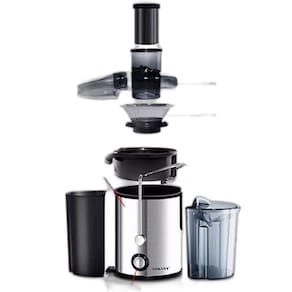 Centrífuga de alimentos elétrica para sucos de frutas e legumes. Possui 2 modos de velocidade, corpo em aço inoxidável, jarra de 500ml e copo de polpa de 1 litro. Inclui sistema de segurança contra superaquecimento.Nº de velocidades