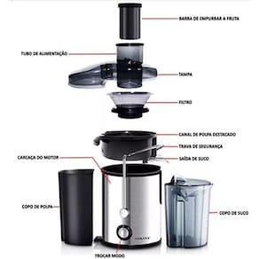 Sucos mais nutritivos: Extrai o máximo de vitaminas, minerais e fibras das frutas e legumes, garantindo um suco mais saudável e completo. Maior rendimento: Aproveita ao máximo cada ingrediente, reduzindo o desperdício e otimizando seus custos. Fácil de limpar: Desmontável e com peças laváveis em lava-louças, facilitando a limpeza e a manutenção. Versátil: Ideal para preparar diversos tipos de sucos, desde os mais simples aos mais elaborados. Design moderno e compacto: Se encaixa perfeitamente em qualquer cozinha, ocupando pouco espaço. Material resistente e durável: Construído em aço inoxidável, garantindo maior durabilidade e higiene.