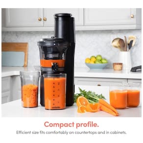 Centrífuga de frutas Nutribullet com motor de 150W, design ultracompacto, baixa velocidade de 65 RPM para extração máxima de nutrientes e calha de alimentação de 3 polegadas.