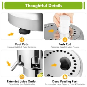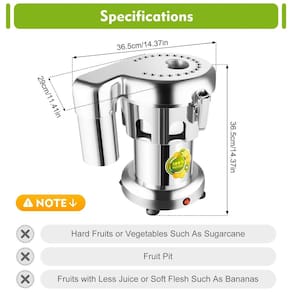 ALTA QUALIDADE O espremedor de frutas elétrico é feito de aço inoxidável de qualidade alimentar e material de liga de alumínio, tem uma longa vida útil e evita a ferrugem. Velocidade de rotação de 2800 rpm, produz até 80 100kg, h, espremedor centrífugo de grande capacidade tanto para uso quanto doméstico. APROVEITE SUCO 100 NATURAL Não precisa de preparação, insira limões, limas e laranjas completos. Esta máquina de espremedor elétrica é tão conveniente de usar e você pode obter todo o suco da fruta. É um processo maravilhoso fazer sucos de todos os gostos em uma cozinha confortável. FUNÇÃO Ajuste as saídas de suco em 8 posições diferentes. Frutas, sucos de vegetais e resíduos de frutas e vegetais podem ser separados. Você pode extrair muito suco de laranjas, limões, limas, toranjas e outras frutas e vegetais, enquanto complementa com vitamina C para aumentar a imunidade