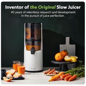 Centrífuga de frutas automática HUROM H200 com design ergonômico, tremonha de alimentação automática, sistema de limpeza fácil e tamanho compacto.