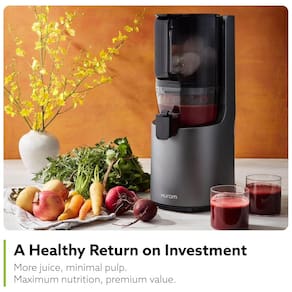 Tremonha de alimentação automática V2 O espremedor lento H200 vem com uma tremonha de alimentação automática aprimorada que tem uma boca maior e está equipada com uma entrada para adicionar mais ingredientes enquanto a centrífuga ainda está funcionando. Adequado para frutas inteiras O funil é 3 vezes maior do que um funil de um espremedor de mastigar. Agora você pode adicionar maçãs inteiras sem cortá las. Faça mais suco e economize tempo. Limpeza sem esfrega O espremedor lento H200 está equipado com o conjunto de câmaras Easy Clean, que inclui filtros com ranhuras alongadas em vez de pequenos orifícios. Você pode simplesmente enxaguar as peças debaixo dágua sem a necessidade de esfregar. Pegada menor O contêiner de polpa do H200 Centrifuga de Frutas está aninhado dentro da base do espremedor, para que você não precise se preocupar com um local separado para ele em sua bancada. Design ergonômico as curvas e amassados do H200 foram projetados para indicar como as peças se encaixariam umas nas outras. A montagem fácil permite uma experiência de sucos mais perfeita