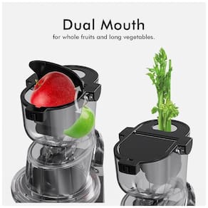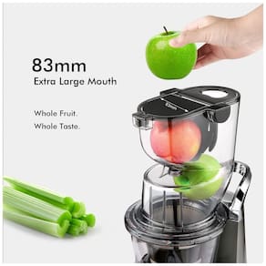 Motor de alto torque e baixa velocidade (60 RPM) para extração lenta, minimizando calor e oxidação. Chute de alimentação extra grande (slot duplo) para frutas e vegetais inteiros. Design com portão de aba anti-gotejamento. Sistema de trava de segurança. Material livre de BPA. Baixo nível de ruído (baixo decibel). Duplo sistema de segurança.Nº de velocidades