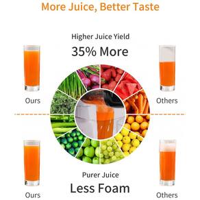 Tenha os sucos mais nutritivos LUFVEBUT lentamente adotam motor sem escova de cobre de alto torque de 250W, ingredientes fáceis de espremer e macios, menos de 80rpm, sem danos às células de suco, reduza o ar no suco, reduza a oxidação, mais delicioso sistema de sucos atualizado, a distância entre o trado e a tela do filtro é reduzida, mais de 40 menor que a distância de prensagem comum do produto, para que o suco tenha um sabor mais delicado e mais retenção de nutrientes.
