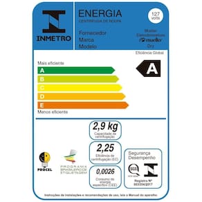 Centrífuga Mueller Dry com capacidade de 8,8kg de roupa molhada (2,9kg de roupa seca), 1800 rpm, alça para transporte, dupla tampa, cesto interno de plástico e pés antideslizantes.Programas