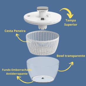 Encaixe na Tampa: A segurança é nossa prioridade. A centrífuga de salada possui um encaixe de tampa que mantem firme. Isso evita acidentes e assegura que o processo de secagem ocorra sem problemas.