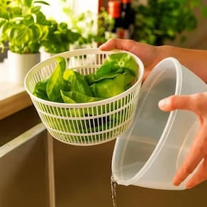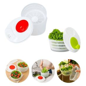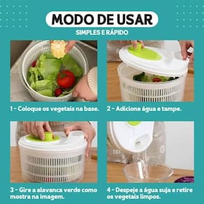 Centrifugador manual para secar salada com cesto escorredor removível. Possui sistema de drenagem na tampa e pode ser utilizado para lavar alimentos.Nº de velocidades
