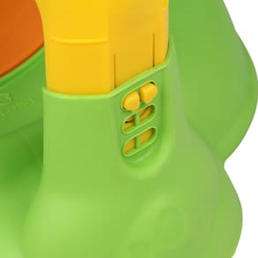 Os efeitos de sons e luzes são alimentados por duas pilhas AA (não inclusas) e a plataforma removível se transforma em mesa ou em um pula-pula. O brinquedo conta com três diferentes opções de altura.