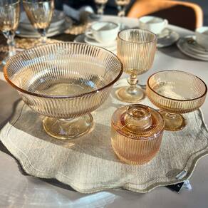 Elegância Duradoura: O relevo listrado e a cor âmbar vibrante criam um visual sofisticado, harmonizando com diversos estilos de mesa ou cristaleira.