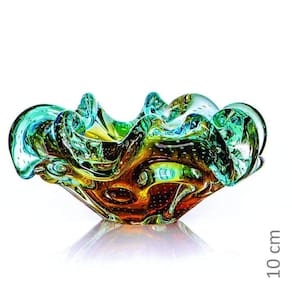 Centro De Mesa Cristal Murano Azul E Âmbar São Marcos 22cm Centro De Mesa Em Cristal Murano Azul E Âmbar - São Marcos é uma peça decorativa produzida 100% artesanalmente com a técnica secular e originária da Itália, a qual com muita maestria e criatividade são desenvolvidas e preservadas no brasil pela Cristais São Marcos desde 1962. A tradição do cristal murano e a inovação em detalhes, formas e cores, trazem requinte para a decoração. O colorido do murano em especial, torna-se um coringa na hora de decorar e produz um efeito muito bonito em locais com luz natural, não dependendo de nenhum outro elemento para se destacar. As peças em cristal murano, são atemporais, aposte nelas como a estrela da decoração ou ainda para harmonizar em combinações com diferentes artigos para compor um ambiente. FICHA TÉCNICA Marca: São Marcos Modelo: Centro De Mesa Em Cristal Murano Azul E Âmbar - São Marcos Ref.: 2529ZA Material: Cristal Murano Medidas A x C x L : 10 X 22 X 22 cm Peso: 2,650 Conteúdo Da Embalagem: 01 Centro De Mesa Em Cristal Murano Azul E Âmbar - São Marcos Junto com as peças em murano, leve ainda um pouco de história. Uma dica é misturar diferentes muranos e criar sua coleção de arte particular. O cristal murano, tornou-se objeto de desejo por suas características únicas. Sendo assim, com todas essas particularidades, ele é uma ótima escolha para decorar, colecionar e ainda presentear com classe e sofisticação. IMPORTANTE: Produto produzido de forma artesanal, são admitidas nas características finais do processo de produção desse produto pequenas variações de peso, formato, cor e ainda o aparecimento de minúsculas bolhas de ar, típicas do cristal murano.