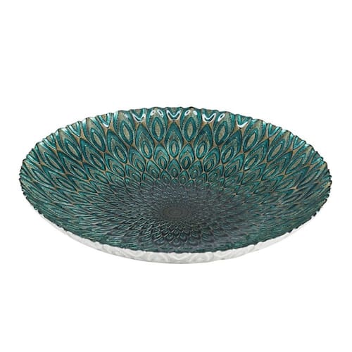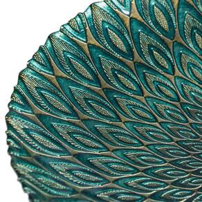 O centro de mesa de vidro Peacock da Wolff é todo composto de vidro com um fundo verde e detalhes em dourado com um efeito brilhante, que remetem a plumagem do pavão. Perfeito para tornar o ambiente mais elaborado e glamoroso.