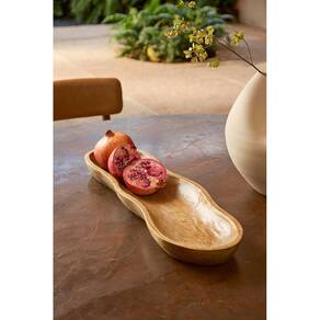 Produzido em madeira, o centro de mesa decorativo combina design orgânico e acabamento natural, destacando os veios e tonalidades característicos do material. Seu formato curvo e alongado proporciona um visual elegante e diferenciado, ideal para compor mesas e superfícies decorativas com estilo e personalidade.