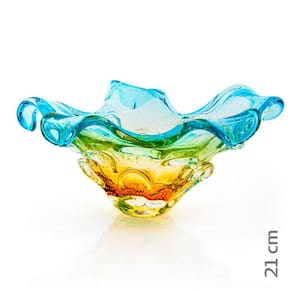 Centro De Mesa Em Cristal Murano Azul E Ambar São MarcosComprimento:45cmLargura:45cmAltura:21cmPeso:8300gProduzida 100% artesanalmente com a técnica secular e originária da Itália, a qual com muita maestria e criatividade são desenvolvidas e preservadas no Brasil pela Cristais São Marcos desde 1962. As escolhas das peças são versáteis e podem ser usadas para decorar casas e ambientes dos mais variados estilos. A tradição do Cristal Murano e a inovação em detalhes, formas e cores, trazem requinte para a decoração. O colorido do Murano em especial, torna-se um coringa na decoração e produzem um efeito muito bonito em locais com luz natural, não dependendo de nenhum outro elemento para se destacar. As peças em Cristal Murano, são atemporais, aposte nelas como a estrela da decoração ou ainda para harmonizar em combinações com diferentes artigos para compor um ambiente. Junto com as peças em Murano, leve ainda um pouco de história. Uma dica é misturar diferentes Muranos e criar sua coleção de arte particular. O cristal Murano, tornou se objeto de desejo por suas características únicas. Sendo assim, com todas essas particularidades, ele é uma ótima escolha para decorar, colecionar e ainda presentear com classe e sofisticação.