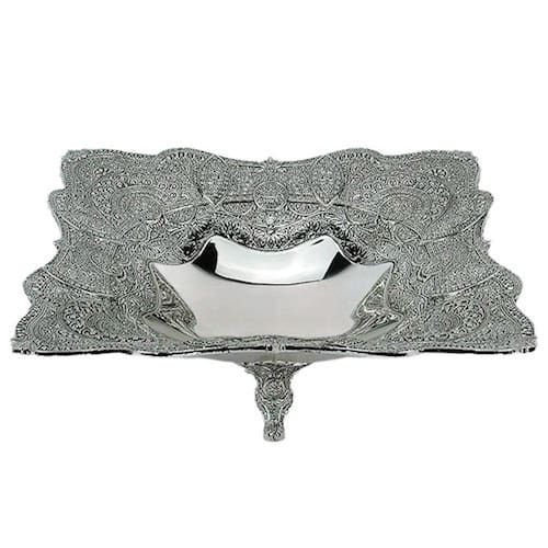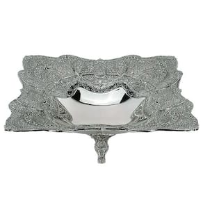 Este centro de mesa combina harmoniosamente o metal prateado com detalhes antigos, resultando em uma peça de destaque que encantará a todos que a virem. Se você busca uma decoração luxuosa e um toque clássico, este é o item perfeito.