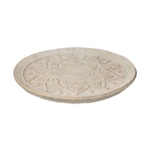 O Centro de Mesa Tiki tem 25 cm e é produzido em resina, com acabamento rústico e detalhes geométricos em baixo relevo destacando a mandala no centro.