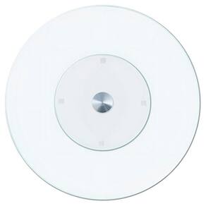 Diâmetro do prato: 60cm Diâmetro da base: 30cm Espessura vidro: 8mm Material: Vidro temperado incolor / aço inox