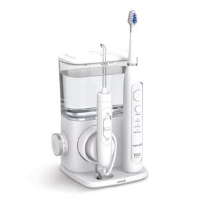 Cepillo de dientes eléctrico Waterpik Complete Care 9.0 con irrigador dental, modelo CC-01 en color blanco. - DISPOSITIVO DE CUIDADO ORAL TODO EN UNO: Complete Care presenta un cepillo de dientes eléctrico recargable que encaja en la base de carga integrada en el irrigador dental, para que disfrutes del cepillado y la irrigación en un diseño compacto y conveniente que ahorra espacio en el mostrador y enchufes. - TECNOLOGÍA AVANZADA: El irrigador dental cuenta con 10 niveles de presión para una limpieza personalizada y rotación de punta de 360 grados para alcanzar toda la boca, incluidos los molares posteriores. El cepillo Triple Sonic ofrece 3 modos de cepillado sónico: Limpieza, Blanqueado y Masaje. - RESERVORIO DE AGUA GRANDE Y CONTROL DE FLUJO: El irrigador dental tiene una capacidad de 650 ml, proporcionando más de 90 segundos de uso sin necesidad de rellenar. Controla fácilmente el flujo de agua con el interruptor de encendido/apagado en el mango. - EFECTIVO: El sistema Waterpik Complete Care 9.0 combinado elimina hasta el 99.9% de la placa bacteriana en las zonas tratadas y está clínicamente comprobado que es hasta 2 veces más efectivo que el hilo dental para eliminar placa y mejorar la salud de las encías. - INCLUYE: 5 puntas para irrigador dental para diversas necesidades dentales y múltiples usuarios, 2 cabezales de cepillo, estuche premium para viaje y estuche para almacenamiento de puntas. Funciona con 120VAC/60Hz para uso exclusivo en Norteamérica. - GARANTÍA Y SOPORTE: Respaldado por una garantía limitada del fabricante de 2 años, consulte el manual para más detalles. El equipo de soporte de Waterpik en Colorado está disponible para ayudar con cualquier consulta o necesidad relacionada con el producto.