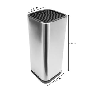 faca. Revestimento externo em aço inox. Desmontável para facilitar limpeza. Pode guardar de 06 a 08 facas, dependendo do tamanho.