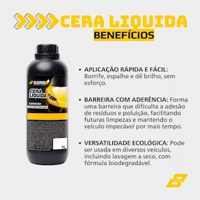A Cera Líquida é uma cera de fácil aplicação, feita com carnaúba e silicones, que foi desenvolvida para ser usada após a lavagem do veículo. Sua fórmula possui uma tecnologia que encapsula as partículas de sujeira, permitindo a remoção sem riscar a superfície. O produto é biodegradável e ideal para manter a aparência da lataria.