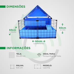 CARACTERÍSTICAS - Cores: Azul, Vermelho, Branco e Preto - Dimensões (LxCxA): 60x60x60cm - Telas: 30x30cm e 30x40cm - Malha: 5x5cm - Modelo: Casinha - Forração: Polionda - Fundo Aramado: Sim