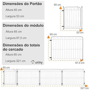 Cercado Dobrável Pet Mix 3 Lados Cachorro Cães Bebê Branco Bem-vindo à UTILITY Somos uma loja online especializada em utilidades PET, utilidades Domésticas e produtos Pegue e Faça você mesmo Descrição do produto:Cercado Dobrável de 3 Lados + Portão Conteúdo da Oferta:- 01 Portão Modular Cor Branco- 03 Módulos na Cor Branco- 06 Abraçadeiras para unir as partes do cercado- 04 Abraçadeiras para fixação Benefícios:- Possibilidade de uso de uma, duas, três ou quartro partes do cercado- Acompanha abraçadeiras para fixar o cercado na parede ou porta- Fácil de montar e de desmontar- Fácil de guardar- Protege seu pet Especificações do Produto:- Material: Aço carbono com tratamento antiferrugem- Cor: Branco- Tratamento antiferrugem- Peso: 6,10 kg dimensões Embalado - Altura: 66 cm - Largura: 90 cm - Profundidade: 9 cm dimensões do Cercado Aberto:- Em linha reta: 3,21 metros Portão:- Altura: 65 cm- Largura: 53 cm- Profundidade: 3 cm Módulo- Altura: 65 cm- Largura: 87,5 cm- Profundidade: 3 cm Garantia: 6 meses por defeito de fabricação Aguardamos seu retorno Equipe Utility