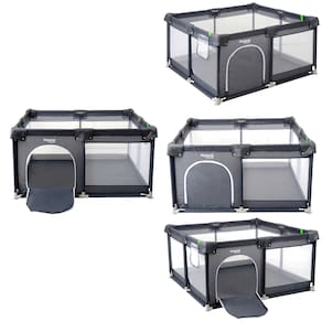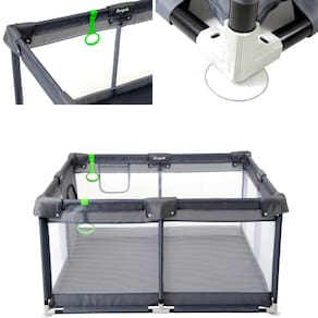 O cercado possui telas laterais nos quatro lados, proporcionando ventilação e visibilidade do interior. Conta com abertura lateral com zíper para acesso da criança e estrutura projetada para fixação ao piso. Estrutura e utilização