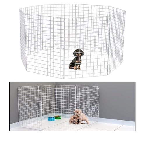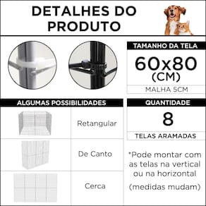 CERCADO CACHORRO ARTICULADO MÓVEL PET 8 TELAS ARAMADAS 60x80 BRANCO * 8 TELAS, VÁRIAS POSSIBILIDADESEste tipo de cercado é montado com telas aramadas e abraçadeiras de nylon, o que o torna um produto versátil para ser montado conforme a sua necessidade, além da possibilidade de simplesmente guardá-lo montado de uma forma que ocupe menos espaço.Serve para animais de pequeno e médio porte ou filhotes como de cachorro e gato. Também é apropriado para coelho, porquinho da índia entre outros pets, com a devida atenção se atravessam ou não a malha da grade.Existe a possibilidade de usar as telas como cerca e portão com as devidas precauções e adaptações por conta do cliente.RECOMENDAÇÕES DE USO:- Filhotes de cachorros e gatos;- Cachorros de pequeno e médio porte;- Porquinhos da Índia, mini coelhos e coelhos.* Recomendamos que sempre verifique antes da escolha se o seu PET não atravessa a malha das telas (buracos) e/ou se ele não salta pelo cercado.DIMENSÕES APROXIMADAS/ POSSIBILIDADES: - Cercado Quadrado 1ª Opção: 120x120X80cm - Cercado Quadrado 2ª Opção: 160x160X60cm - Cercado Retangular 1ª Opção: 180x60x80cm - Cercado Retangular 2ª Opção: 240x80x60cm - Cerca Linha Reta 1ª Opção: 80x480cm (4,8 metros) - Cerca Linha Reta 2ª Opção: 60x640cm (6,4 metros)CARACTERÍSTICAS: - Cor: Branco - Acabamento em pintura eletrostática - Material Tela: Aço - Material Abraçadeira: Nylon - Telas: 60x80cm - Malha: 5cmRECOMENDAÇÃO - Clips auto adesivos servem para ajudar na imobilização do cercado e dispensam furação; - Parafuso gancho ajuda a imobilizar de forma mais firme, pois precisam furar a parede ou chão para colocá-los; - Conectivos ajudam na montagem de um cercado fixo (conectivos são removíveis quando precisar)* Possuímos os mais variados tipos de cercados em modelos e tamanhosITENS INCLUSOS:- 8 telas 60x80cm e abraçadeiras de nylon para montagem de um cercado móvel* Procurou um modelo e não encontrou? Tem algum projeto específico? Não sabe como aumentar seu cercado? Deixe-nos saber e vamos te ajudar!OBSERVAÇÕES: - Garantia de 3 meses contra defeitos de fabricação - O produto vai desmontado para ser montado no local - Imagens ilustrativas e com sugestões de montagem - Não nos responsabilizamos pelo uso inadequado do produtoNão deixe de conhecer nossos outros produtos! Marca: IGUANNA