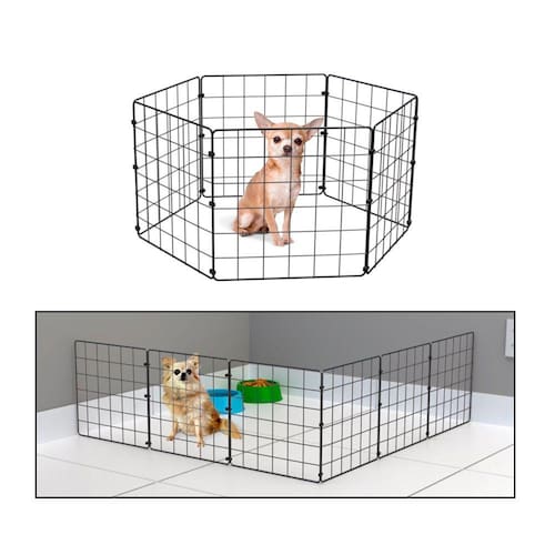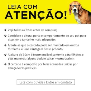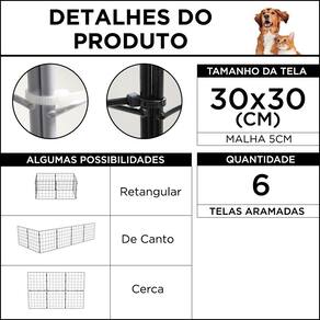 CERCADINHO MÓVEL PARA CACHORRO GATO PEQUENO PORTE PORQUINHO DA ÍNDIA COM TELA ARAMADA 30CM DE ALTURA* 6 TELAS, VÁRIAS POSSIBILIDADESEste tipo de cercado é montado com telas aramadas e abraçadeiras de nylon, o que o torna um produto versátil para ser montado conforme a sua necessidade, além da possibilidade de simplesmente guardá-lo montado de uma forma que ocupe menos espaço.Serve para animais de pequeno porte ou filhotes como de cachorro e gato. Também é apropriado para porquinho da índia entre outros pets, com a devida atenção se atravessam ou não a malha da grade.Existe a possibilidade de usar as telas aramadas como cerca e portão com as devidas precauções e adaptações por conta do cliente.RECOMENDAÇÕES DE USO:- Filhotes de cachorros e gatos;- Cachorros de pequeno porte;- Porquinhos da Índia.* Recomendamos que sempre verifique antes da escolha se o seu PET não atravessa a malha das telas (buracos) e/ou se ele não salta pelo cercado.DIMENSÕES APROXIMADAS/ POSSIBILIDADES: - Cercado Retangular: 30x60cm - Cercado Quadrado ou L: 90x90cm - Cercado Hexágono: 30cm cada lado - Cerca Linha Reta: 180cm (1,8 metro) - Cerca Larga: 60x90cmCARACTERÍSTICAS: - Cor: Preto - Material Tela: Aço - Acabamento em Pintura Eletrostática - Material Abraçadeira: Nylon - Telas: 30x30cm - Malha: 5cmRECOMENDAÇÃO - Clips auto adesivos servem para ajudar na imobilização do cercado e dispensam furação; - Parafuso gancho ajuda a imobilizar de forma mais firme, pois precisam furar a parede/ou chão para colocá-los; - Conectivos ajudam na montagem de um cercado fixo (conectivos são removíveis quando precisar)* Possuímos os mais variados tipos de cercados em modelos e tamanhosITENS INCLUSOS:- 6 telas 30x30cm e abraçadeiras de nylon para montagem de um cercado móvel* Procurou um modelo e não encontrou? Tem algum projeto específico? Não sabe como aumentar seu cercado? Deixe-nos saber e vamos te ajudar!OBSERVAÇÕES: - Garantia de 3 meses contra defeitos de fabricação - O produto vai desmontado para ser montado no local - Imagens ilustrativas e com sugestões de montagem - Não nos responsabilizamos pelo uso inadequado do produtoNão deixe de conhecer nossos outros produtos! Marca: IGUANNA