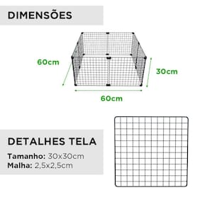 CERCADO ARAMADO PET PORQUINHO DA ÍNDIA HAMSTER TWISTER 60x60x30 MALHA 2,5x2,5 PRETOPara você que ama o seu pet e deseja proporcionar o melhor lugar para ele, os cercados aramados são a sua melhor opção. Eles são compostos de telas aramadas de aço e conectivos de plástico, que é a combinação ideal para uma melhor organização, durabilidade e segurança para o seu animalzinho, além de se adaptar muito bem ao ambiente.É importante que o pet tenha espaço suficiente para ficar confortável no seu dia a dia, por isso a escolha do cercado deve ser feita com cuidado.DIMENSÕES APROXIMADAS: - Largura: 60cm - Comprimento: 60cm - Altura: 30cmCARACTERÍSTICAS: - Cor: Preto - Material: Aço - Telas: 30x30cm - Malha: 2,5cm - Modelo: Simples - Forração: Não Possui - Fundo com Telas: Não* Recomendamos que sempre verifique antes da escolha se o seu PET não atravessa a malha das telas (buracos) e/ou se ele não salta pelo cercado.* Possuímos os mais variados tipos de cercados em modelos e tamanhosITENS INCLUSOS:- Kit de telas e conectivos para montagem de um cercado aramado * Procurou um modelo e não encontrou? Tem algum projeto específico? Não sabe como aumentar seu cercado? Deixe-nos saber e vamos te ajudar!OBSERVAÇÕES:- O produto vai desmontado para ser montado no local e igual a imagem do anúncio;- Recomendamos para porquinhos da índia e coelhos, cercados com forração (Soft/Lona/Polionda/Tapete Higiênico);- Para colocação dos conectivos é preciso fazer um pouco de pressão, por isso sugerimos o uso de um martelinho de borracha (não acompanha o produto). - Imagens ilustrativas - Não nos responsabilizamos pelo uso inadequado do produtoNão deixe de conhecer nossos outros produtos! Marca: IGUANNA