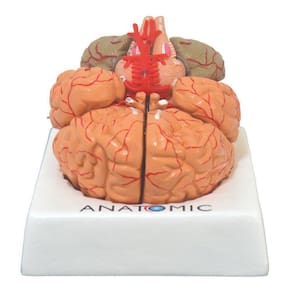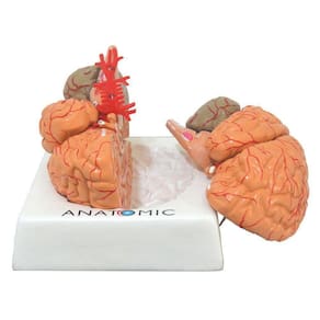 Modelo anatômico, rico em detalhes, apresenta cérebro em corte mediano, exibindo estruturas internas, lobo frontal, parietal, occipital e temporal, tronco cerebral, cerebelo e artérias cerebrais, numerados em 127 regiões específicas para estudo. Confeccionado em resina plástica de alta qualidade.