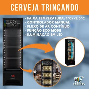 Trabalha com fluxo de ar contínuo para resfriamento rápido e uniforme de garrafas e latas. Seu controlador eletrônico atua para rápida recuperação de temperatura, mesmo após seguidas aberturas de porta, preservando a temperatura ideal de sua cerveja e o baixo consumo de energia!