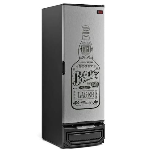 BENEFÍCIOS E DIFERENCIAIS - Conservação e Exposição de Cervejas e Bebidas (Água, Sucos e Refrigerantes) - Refrigeração: Ar forçado com evaporador aletado - Controlador eletrônico com indicador de temperatura - Revestimento Interno: Aço pré-pintado branco - Revestimento Externo: Aço pré-pintado preto - Barra de LED no painel externo - Porta cega em Aço revestido Tipo Inox, com adesivo - Prateleiras aramadas - 3 níveis reguláveis + 1 estrado - Pés niveladores - Equipamento certificado conforme Portaria Inmetro n 371/2009