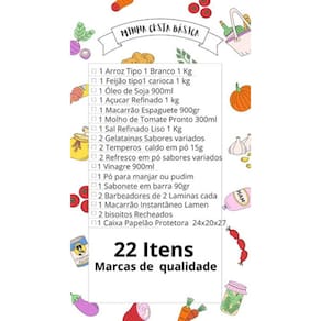 1 arroz branco 1 kg 1 feijão Carioca 1 kg 1 Óleo soja 900ml 1 açúcar refinado 1 kg 2 biscoito recheado 1 macarrão espaguete 500g 1 molho tomate 300ml 1 Sal 1 kg 2 Gelatinas 1 Macarrão Instantâneo lámen 2 Tempero caldo em pó 19gr 2 Refresco em pó 1 Vinagre 1 Pó para manjar/pudim 1 Sabonete Em barra 90g 2 barbeadores 2 laminas cada 1 caixa de Papelão protetora 240x200x270