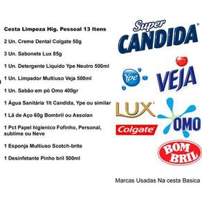 Cesta Basica Higiene E Limpeza 13 Itens Boas Marcas Doação Cesta Básica Limpeza e Higiene Pessoal Produtos de Primeira Qualidade 13 Itens Fotos Reais Produtos de qualidade Cesta montada para quem quer adquirir/doar produtos de alta qualidade, as fotos dos produtos da cesta básica são reais. De 4-5 KG Todos os itens com validade longa, adquirido direto dos fabricantes e/ou distribuidores oficiais. Itens 2 Un. Creme Dental Colgate/ Oral B 90g 3 Un. Sabonete Lux 85g 1 Un. Detergente Liquido Ype Neutro 500ml 1 Un. Limpador Multiuso veja 500ml 1 Un. Sabão em pó Tixan Ypê/ Omo 400gr 1 Água Sanitária 1lt Candida, Ypê ou 1 Lã de Aço 60g Bombril ou Assolan 1 Pct Papel higienico Fofinho, Personal, sublime, Neve ou 1 Esponja Multiuso Scotch-brite 1 Desinfetante Pinho Bril 500ml Obs.: Garantimos as marcas dos produtos da Cesta salvo em caso de escassez ou falta no fabricante/fornecedor, no caso substituiremos por outro de igual qualidade. Marca: Não Informado
