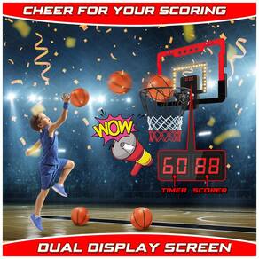 Esta mini cesta de basquete vem equipada com duas telas eletrônicas: um cronômetro à esquerda e um contador de pontos à direita, que calculam e exibem automaticamente a pontuação de forma digital. Cada vez que um gol é marcado, você é recompensado com um som alegre e luzes LED piscantes, celebrando a pontuação. É a combinação perfeita de diversão para crianças e relaxamento para adultos, tornando-se um jogo ideal para uma pausa divertida durante o trabalho ou a rotina diária.