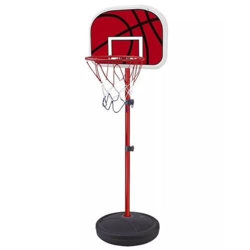 Kit basquete completo com haste extensora de sustentação em metal leve com altura ajustável, base portátil feita de alta qualidade podendo preenche-la com areia ou água para deixar a cesta mais estável, cesta para os arremessos e enterradas da criançada, bola de plástico, bomba de ar manual para encher sempre que precisar e uma rede.