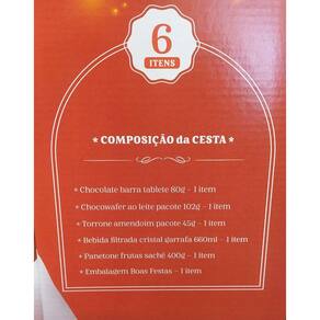 Chocolate barra tablete 90gr. 1 Unidade Chocowafer ao leite Pacote 102gr. 1 Unidade Panetone de Frutas 400gr. 1 Unidade Bebida filtrada Cristal Garrafa 660mL 1 Unidade Torrone de Amendoim Pacote 45gr. 1 Unidade Embalagem Boas Festas Unidade 1 Unidade