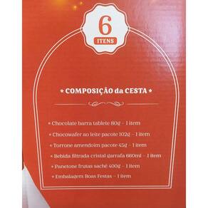 Você encontrou o que procurava: Uma cesta de natal com um excelente Custo-benefício Ideal para empresas presentear seus funcionários. Cesta de Natal Boas Festas com 06 itens: Chocolate barra tablete 90gr. 1 Unidade Chocowafer ao leite Pacote 102gr. 1 Unidade Panetone de Frutas 400gr. 1 Unidade Bebida filtrada Cristal Garrafa 660mL 1 Unidade Torrone de Amendoim Pacote 45gr. 1 Unidade Embalagem Boas Festas Unidade 1 Unidade ATENÇÃO: Quantidade máxima por pedido 6 Unidades Você pode comprar quantidades maiores mas cada tem a capacidade máxima de 06 cestas. : Posso Comprar 10 ou mais unidades Resp: Sim, desde que cada pedido não ultrapasse 06 unidades, por exemplo para comprar 10 Unidades você deve realizar 1 compra com 06 Cestas finalizar a compra e realizar outra compra Com 04 cestas e assim sucessivamente. Parabéns pela compra, excelente escolha Feliz Natal. Marca: Não Informado