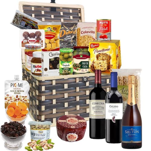 1 Vinho Chileno TARAPACA Cosecha Cabernet 750ml 1 Vinho Chileno CHILANO Merlot 750ml 1 Espumante Brut Salton 750ml 1 Panetone BAUDUCCO Frutas 500g 1 PIC-ME Amendoim Integral 200g 1 Pasta de Avelã NUTELLA 350g 1 Pêssego em Calda Diet São Lourenço 350g 1 Figo em Calda São Lourenço 450g 1 Goiabada Cascão TIA CARLA 400g 1 Doce de Leite Tradicional Portão do Cambui 200g 1 Bala Italiana De Goma De Alcaçuz Dietorelle 70g 1 Merengue com Chocolate MELARÉ 100g 1 Mandolate Cellena 160g 1 Pistache Americano Torrado e Salgado CELLENA 200g 1 Damasco Turco Cellena 200g 1 Macarrão Gomiti COLAVITA Grano Duro 500g 1 Tomate Pelado MUTTI Lata 400g 1 Azeitona BONDUELLE Verde com Caroço 320g 1 Uva Passa Preta FLORA s/ semente FLORA 250g 1 Flocos de Arroz Caramelizado FIBRASMIL 100g